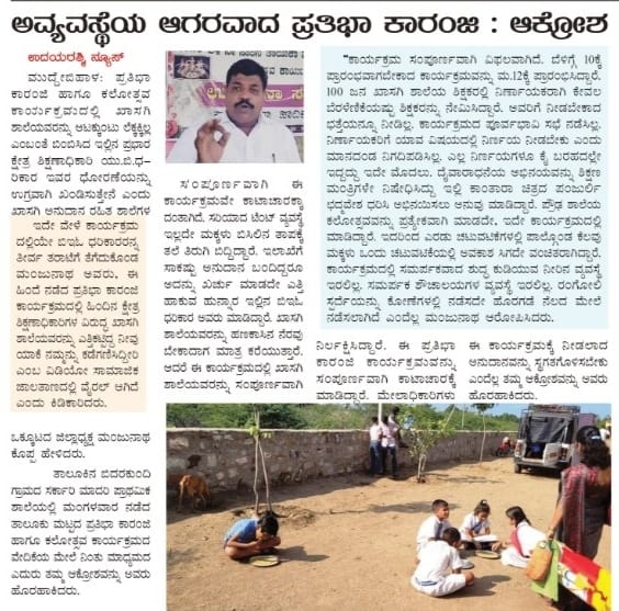 ಮುದ್ದೇಬಿಹಾಳ: ಇತ್ತೀಚೆಗೆ ತಾಲೂಕಿನ ಬಿದರಕುಂದಿ ಗ್ರಾಮದ ಸರ್ಕಾರಿ ಮಾದರಿಯ ಪ್ರಾಥಮಿಕ ಶಾಲೆಯಲ್ಲಿ ನಡೆದ ಪ್ರತಿಭಾ ಕಾರಂಜಿ ಹಾಗೂ ಕಲೋತ್ಸವ ಕಾರ್ಯಕ್ರಮವನ್ನು ಸರಿಯಾಗಿ ನಿರ್ವಹಿಸದೇ ಕಾಟಾಚಾರಕ್ಕೆ ಕಾರ್ಯಕ್ರಮ ನಡೆಸಲಾಗಿದೆ ಎಂಬ ಗಂಭೀರ ಆರೋಪಗಳು ಕೇಳಿ ಬಂದಿದ್ದವು. ಈ ಕುರಿತು ’ಉದಯರಶ್ಮಿ’ ಪತ್ರಿಕೆಯಲ್ಲಿ “ಅವ್ಯವಸ್ಥೆಯ ಆಗರವಾದ ಪ್ರತಿಭಾ ಕಾರಂಜಿ :ಆಕ್ರೋಶ” ಎಂಬ ಶೀರ್ಷಿಕೆಯಡಿ ಸುದ್ದಿ ಪ್ರಕಟಿಸಿತ್ತು.