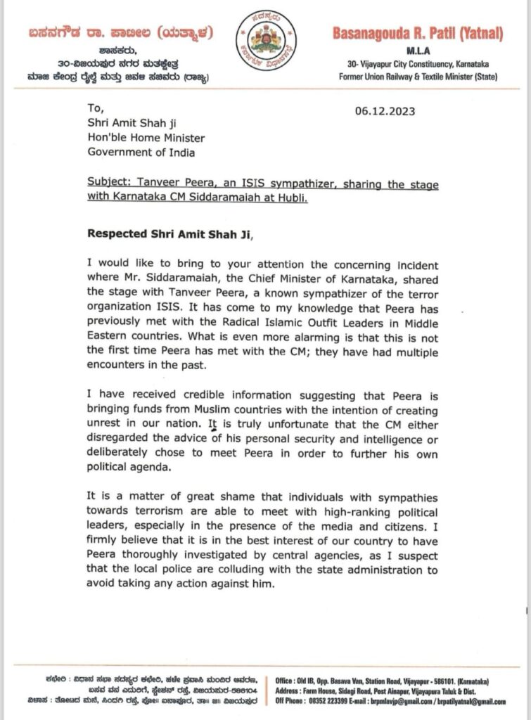 ವಿಜಯಪುರ: ಭಯೋತ್ಪಾದಕ ಸಂಘಟನೆ ಐಸಿಎಸ್ ಕ್ಯಾತಿಯ ತನ್ವೀರ್ ಪೀರಾ ಅವರೊಂದಿಗೆ ಕರ್ನಾಟಕ ಮುಖ್ಯಮಂತ್ರಿ ಸಿದ್ದರಾಮಯ್ಯ ಅವರು ವೇದಿಕೆ ಹಂಚಿಕೊಂಡಿರುವ ಕುರಿತಂತೆ ಶಾಸಕ ಬಸನಗೌಡ ಪಾಟೀಲ ಯತ್ನಾಳ ಅವರು ಕೇಂದ್ರ ಗೃಹ ಸಚಿವ ಅಮಿತ್ ಶಾ ಅವರಿಗೆ ಬುಧವಾರ ಪತ್ರ ಬರೆದಿದ್ದಾರೆ.