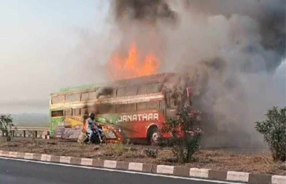 ವಿಜಯಪುರ: ಟೈಯರ್ ಬ್ಲಾಸ್ಟ್ ಆಗಿ ಏಕಾಏಕಿ ಜನತಾ ಟ್ರಾವೆಲ್ಸ್ಗೆ ಸೇರಿದ ಬಸ್ ಸುಟ್ಟು ಭಸ್ಮವಾಗಿರುವ ಘಟನೆ ವಿಜಯಪುರ ತಾಲೂಕಿನ ಹಿಟ್ಟಿನಹಳ್ಳಿ ಬಳಿ ನಡೆದಿದೆ.